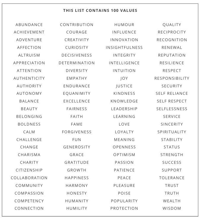 Review the list of 100 values in the image below and select 20 that you feel align with the reasons why you felt happy, proud, satisfied and fulfilled in those experiences.